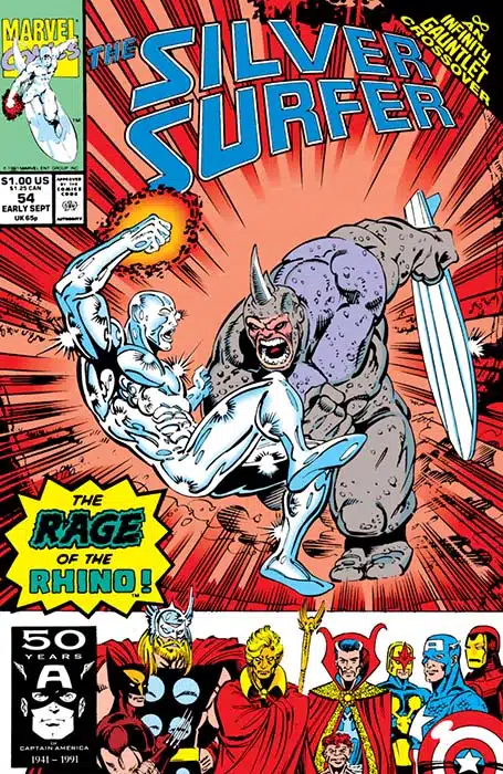 Story continued from Infinity Gauntlet #2. As the heroes of Earth marshal their forces for the coming battle with Thanos, the Silver Surfer must face the Rage of the Rhino ! And other animals !